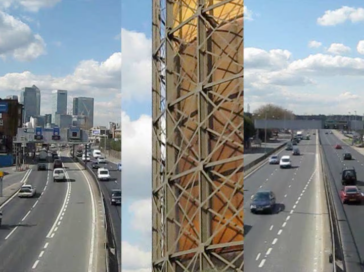 The immersive video is set on a London highway in the Greenwich Peninsula. It features factories that have since then been demolished. But the bus stop is still there…