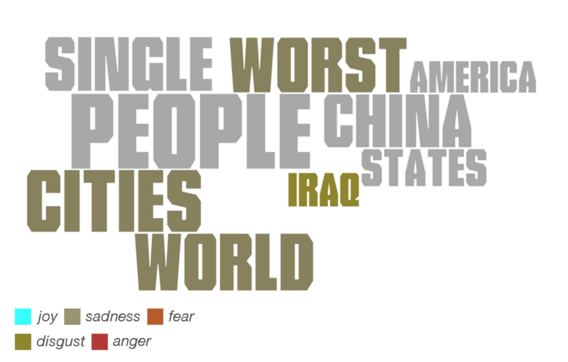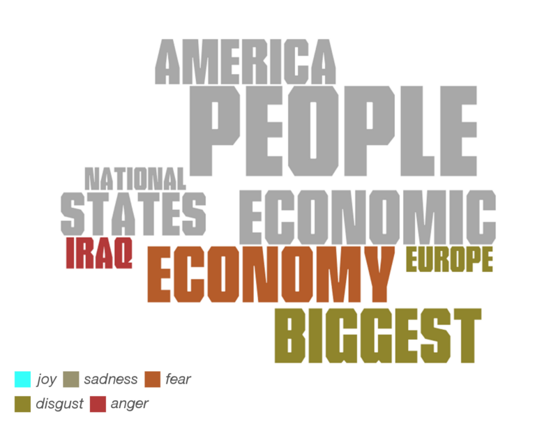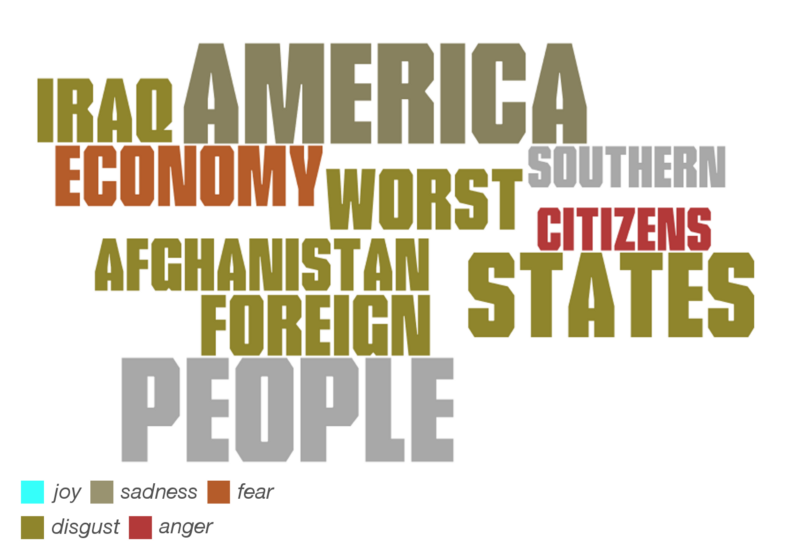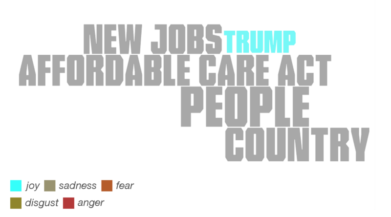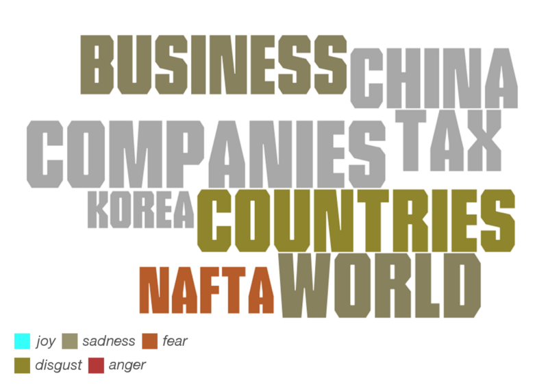 Terms that were closely related to trade (deals) in Donald Trump’s vocabulary where Nafta (used with fear), China, Korea (?), the world (used with sadness), countries (disgust), and other economic terms such as tax, business, and companies.
