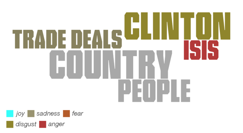 Donald Trump talked about trade deals with sadness. He was angry when talking about ISIS, and disgusted when talking about Clinton. His use of his opponent’s name appears to have been more relevant than for the two other candidates.