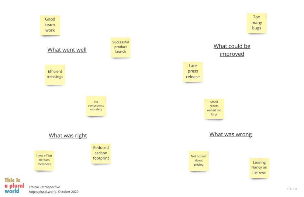 Complementary to these meetings is the opportunity to broaden the scope of continuous improvement activities: make continuous improvement not only a matter of efficiency and product quality but also of ethics. Take for instance team retrospectives, a regular continuous improvement workshop used in software development, and imagine what it could look like if it was used not only for team members to improve the way they work, but also make more good within and outside their team and organization. The regular practice would encourage teams to reflect not only on what does and does not work in their day-to-day dealings, but also about what is good or bad, positive or negative to pursue.