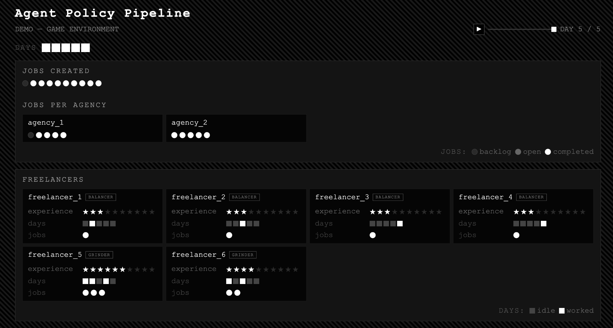 - An animated visualization — an HTML report showing job flows, skill progression, freelancer utilization, and observer insights over time. You can see exactly what happened, when, and which agent was responsible.